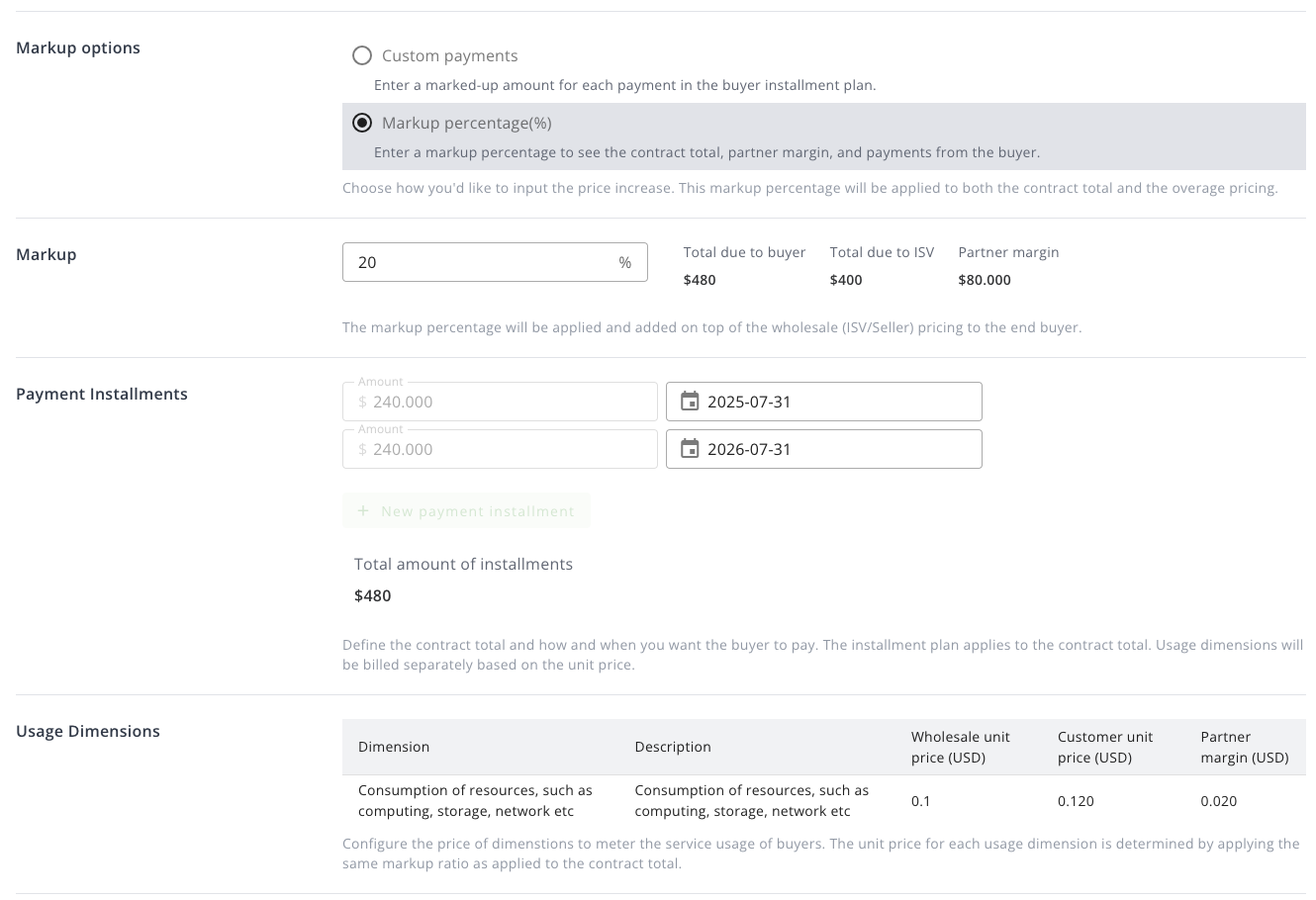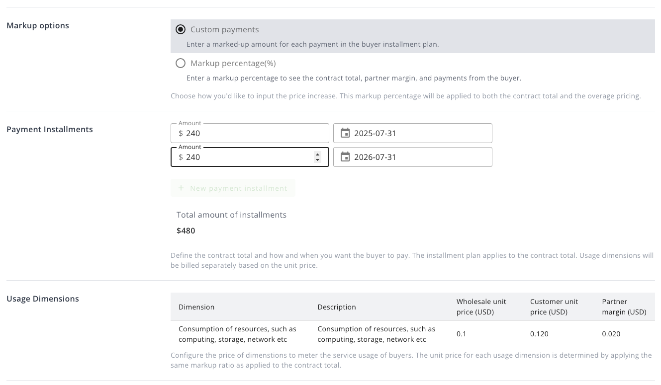 Custom Payments: Instead of providing a percentage, you can set the custom payments for each installment. The sum of all installments will be the contract price. The implicit markup percentage will be calculated based on the custom payments and the wholesale pricing, usage dimensions prices will be updated automatically based on the implicit markup percentage.