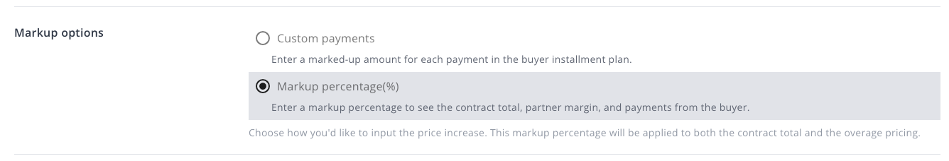 Markup PercentageandCustom Paymentsto set the markup, and for other private offers, the only available option isMarkup Percentage, so this field will be hidden.