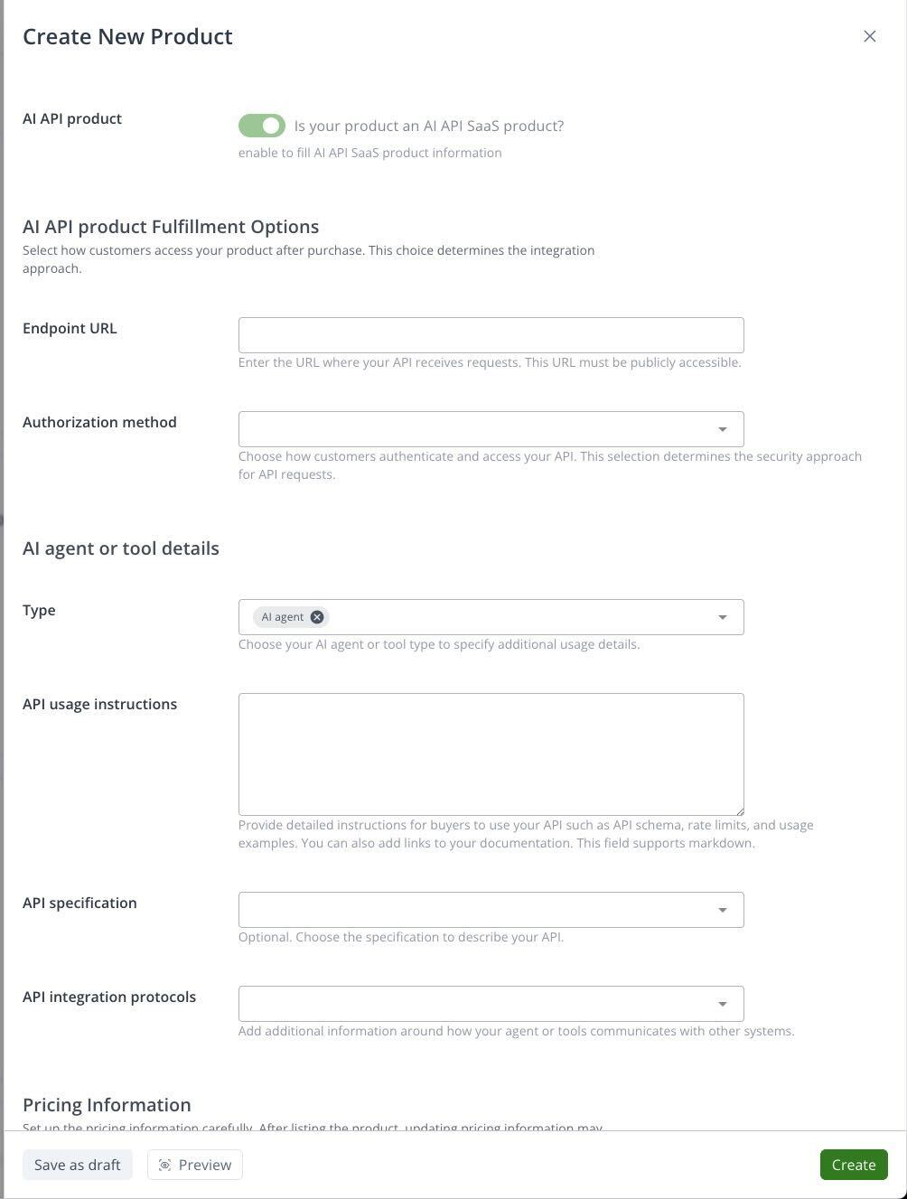 For AI SaaS API products, you can provide additional details to enhance the listing on AWS Marketplace. When you create a new product, enable the Is your product an AI API SaaS product? toggle. This will present you with additional fields to describe your AI product.