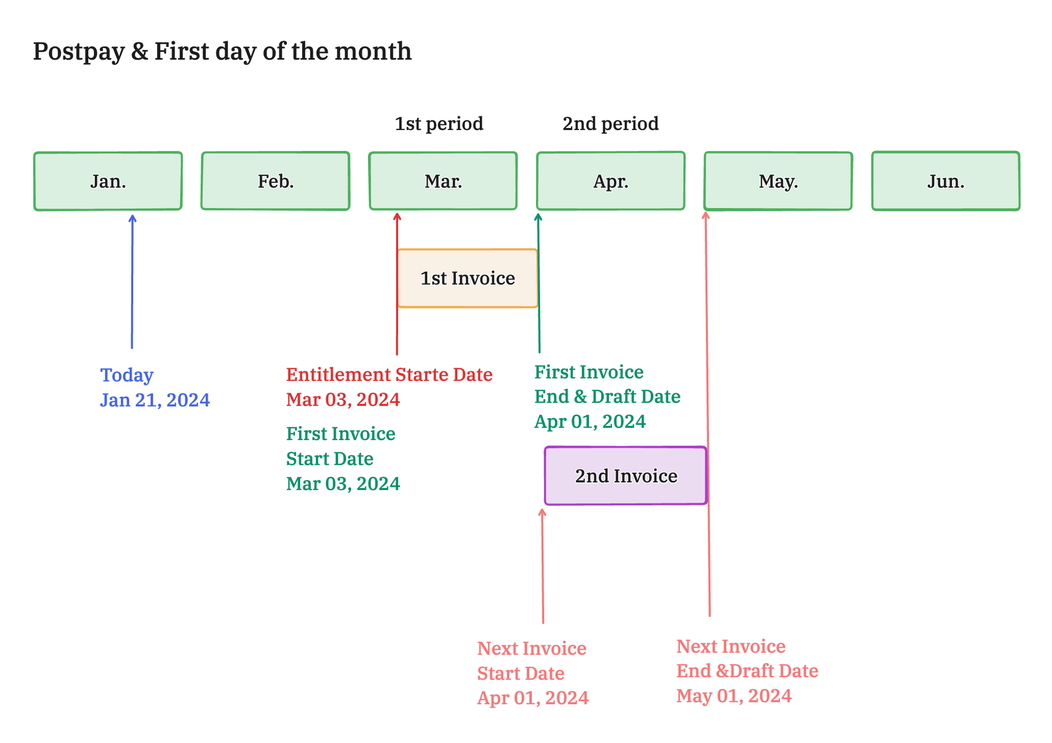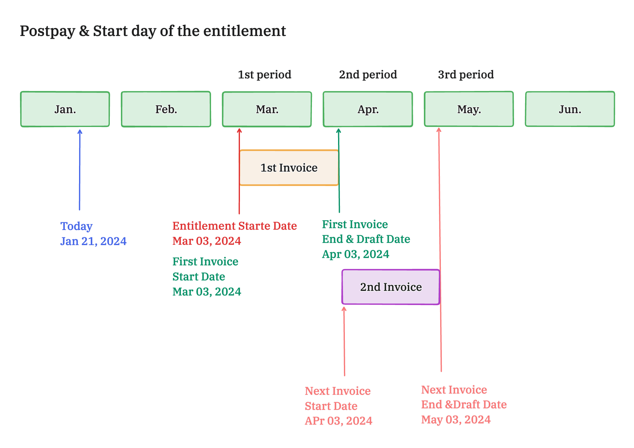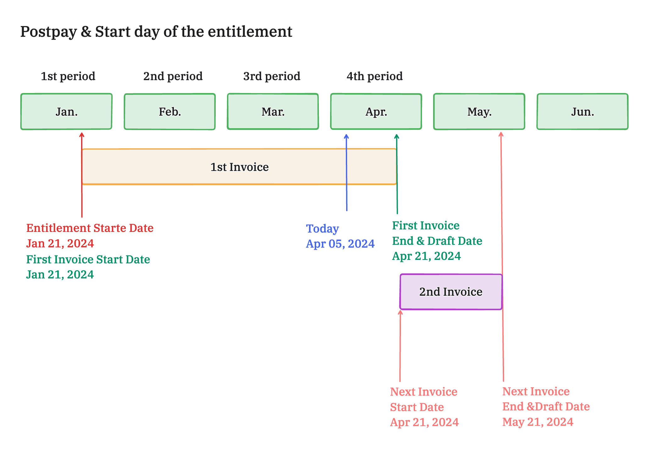 | Past | Start of the Entitlement | Postpay | Entitlement's start date | Entitlement's start date in the next period. | Same as the end date |