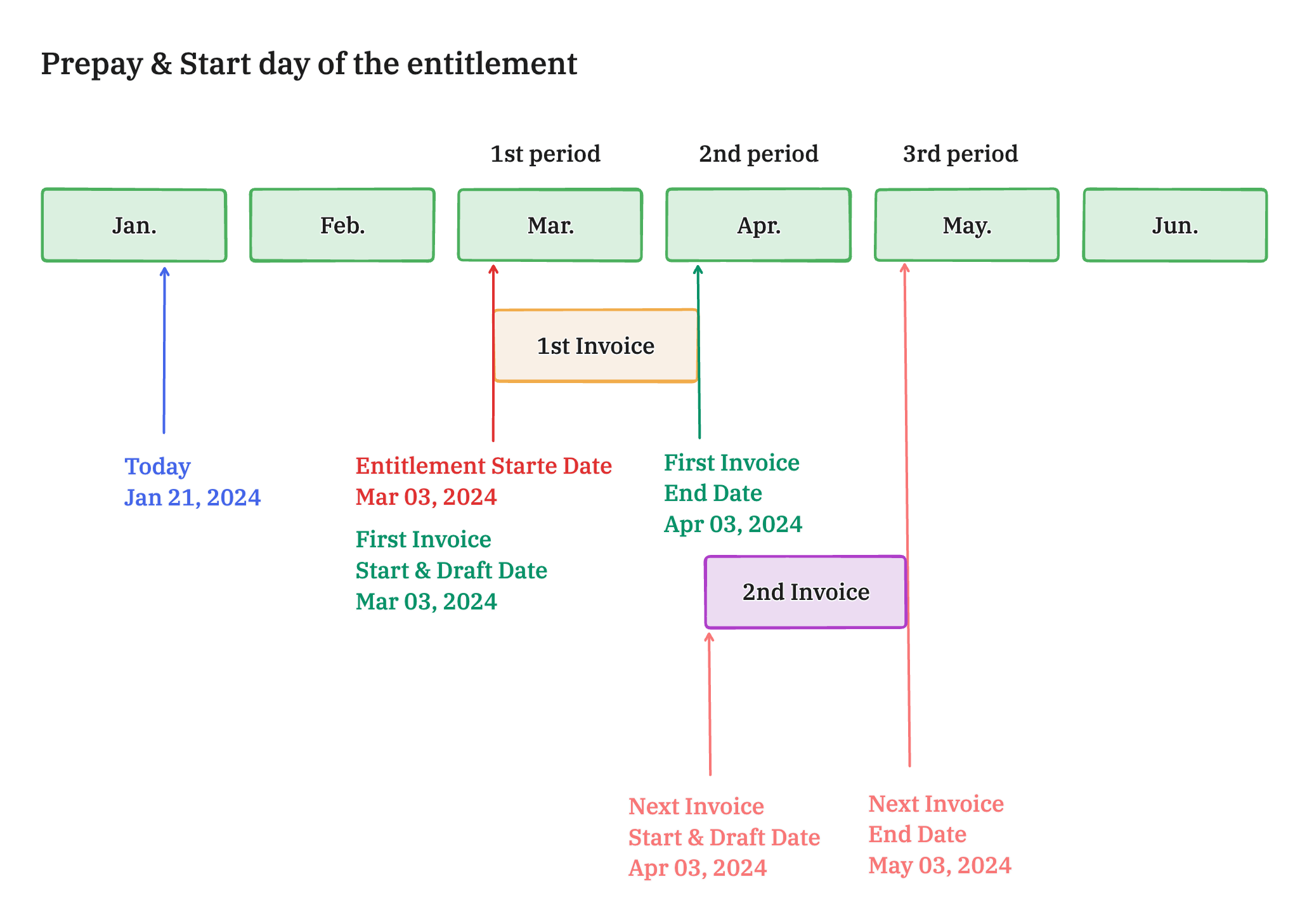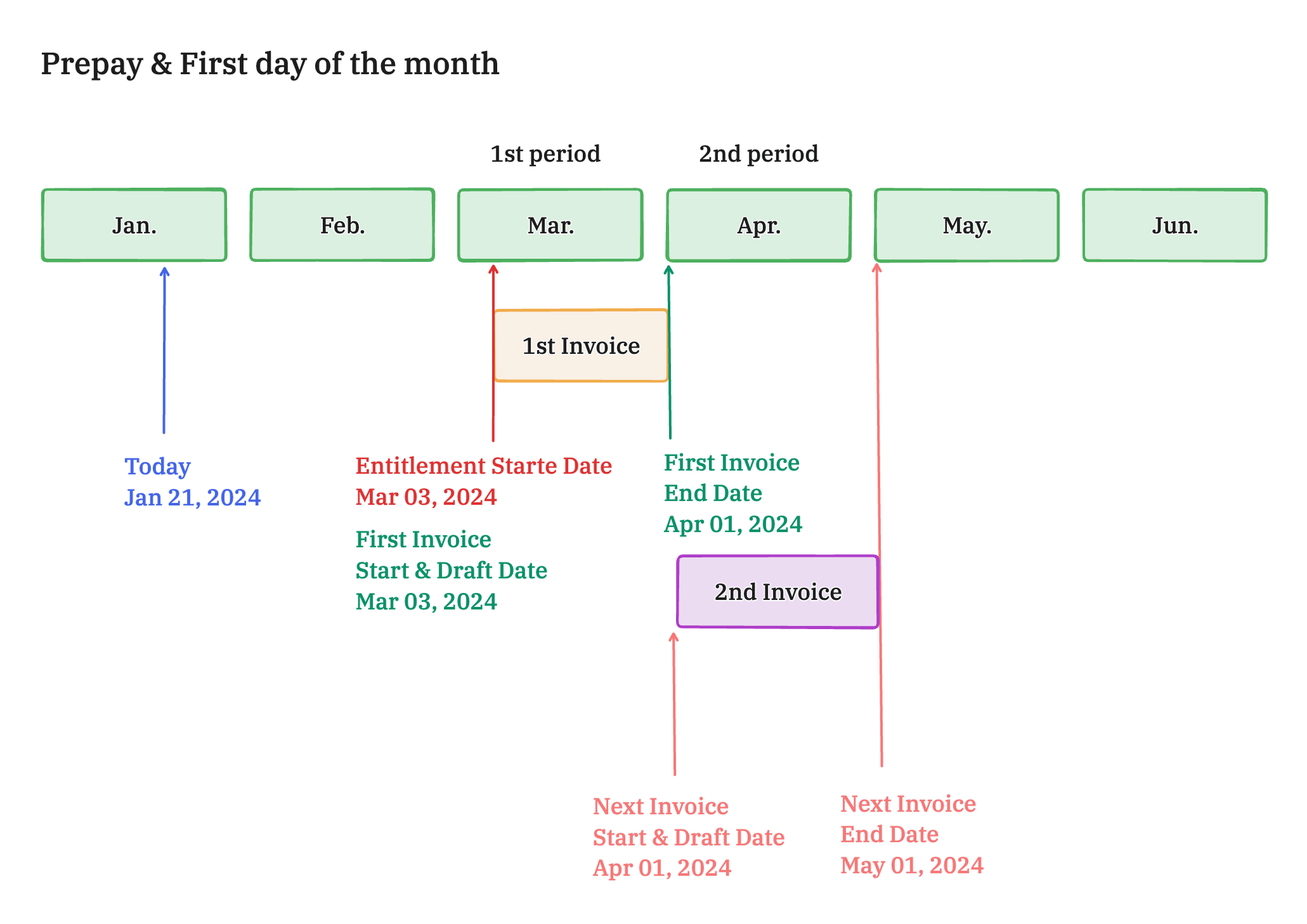 | Past | Beginning of the Month | Prepay | Entitlement's start date | Nearest first day of the month | Today |