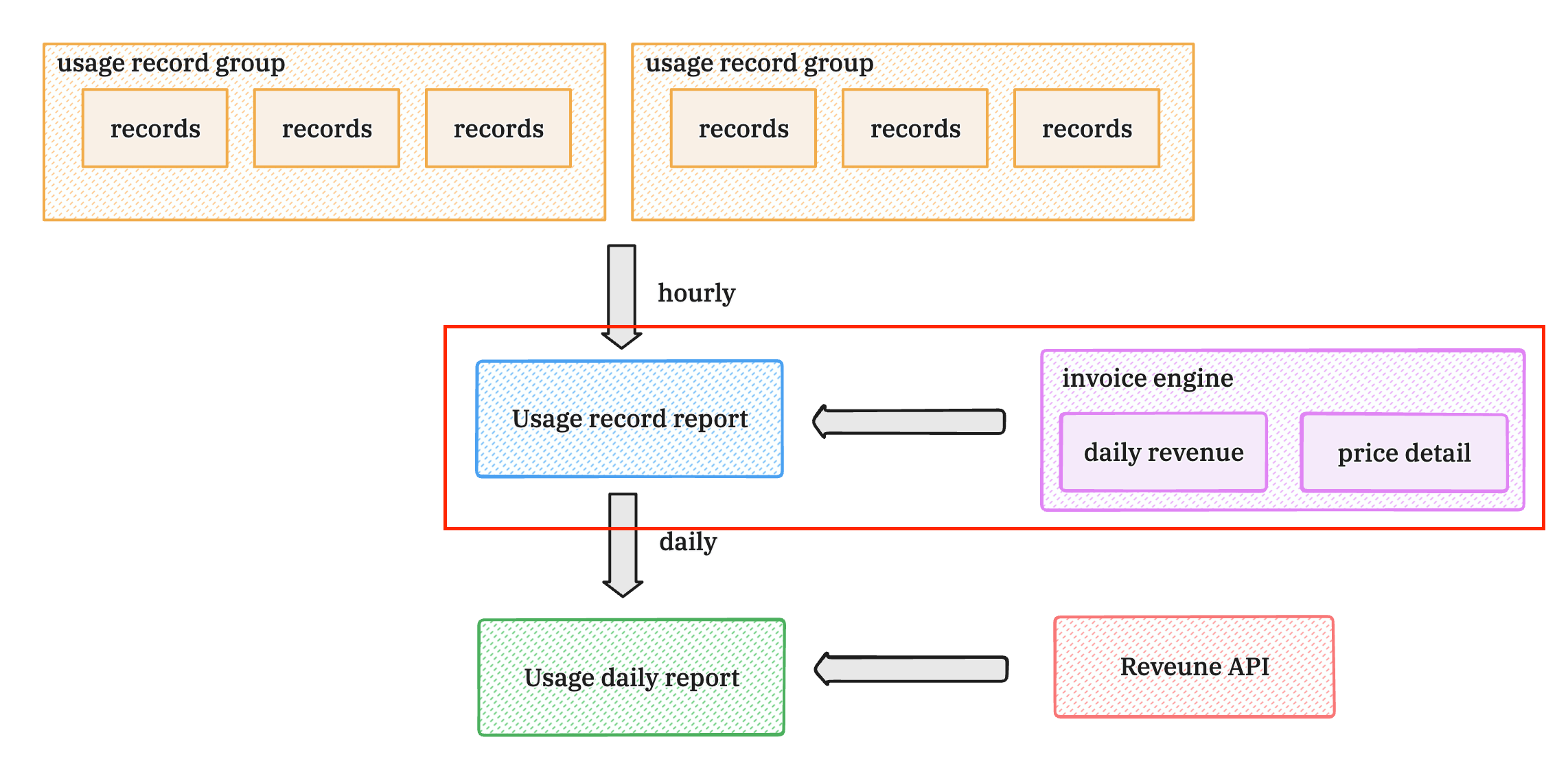 Usage Charge Fee will be calculate based on the Usage record reports (Hourly reports shown in the red box) to create a Usage invoice: