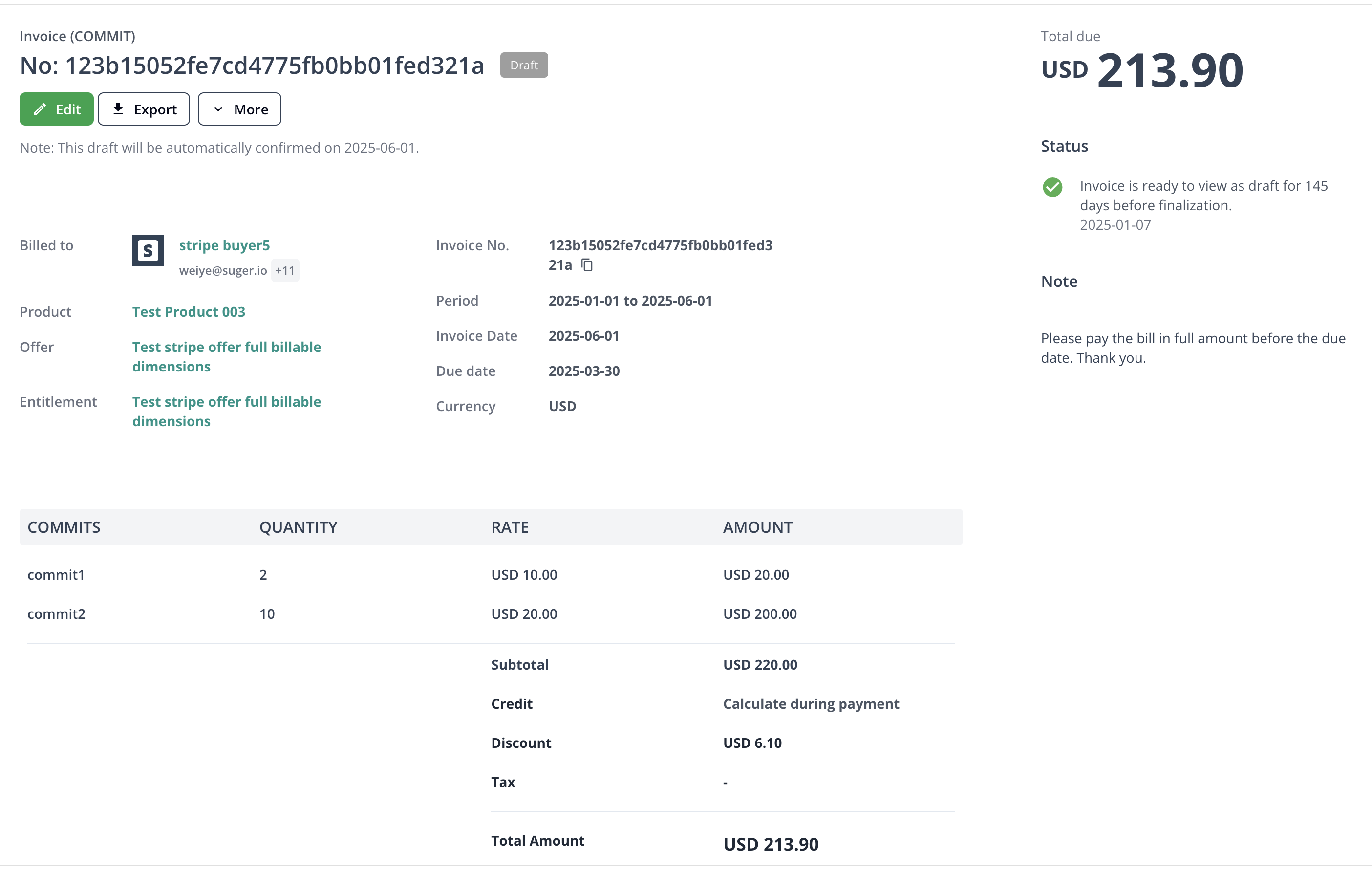 For example, if an entitlement includes both Commitment and Billable Dimension(s) pricing terms, two invoices will be created: one for the Commitment and one for the Billable Dimension(s).