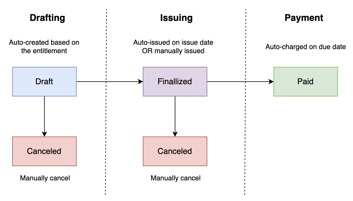 The invoice lifecycle consists of the following stages: Drafting, Issuing and Payment.