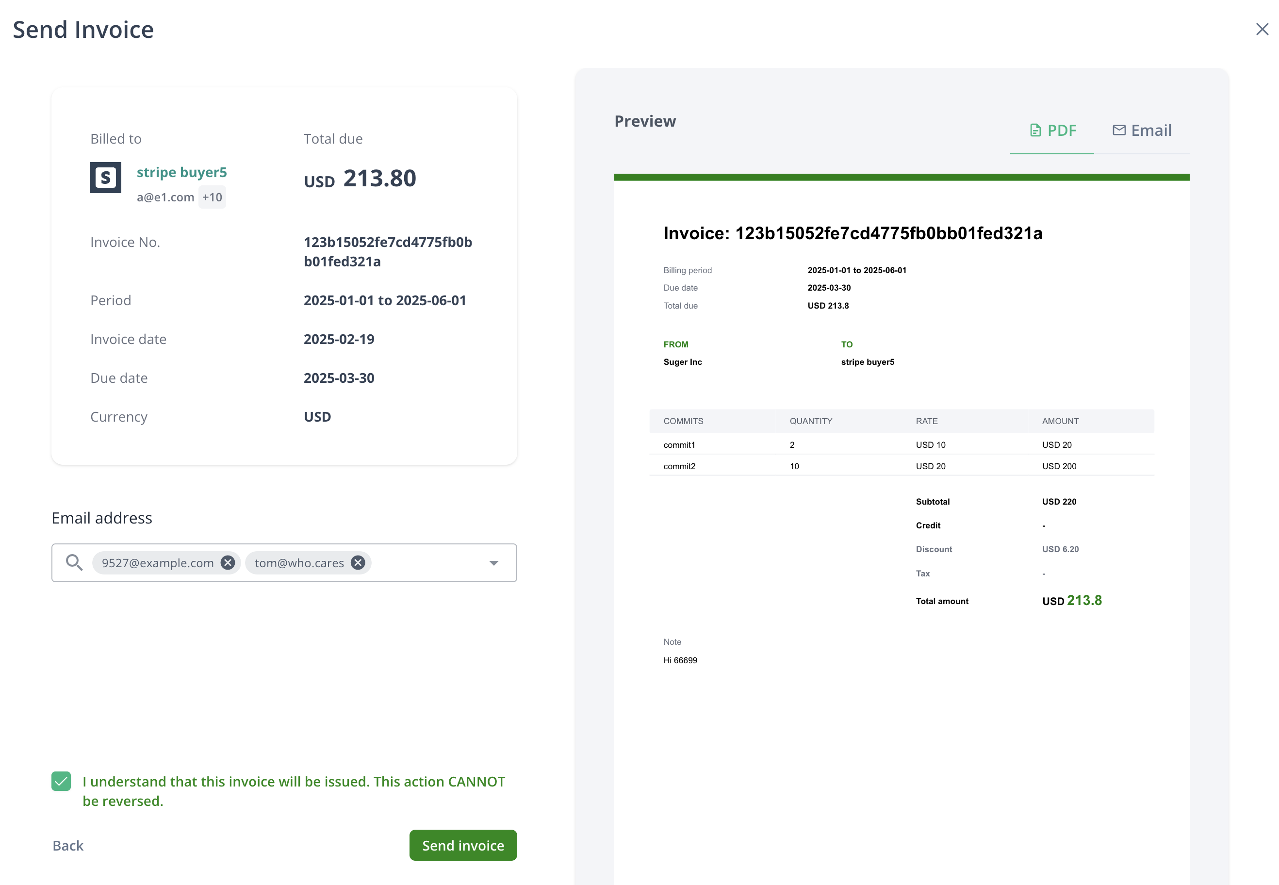 - Preview the invoice PDF and email content.