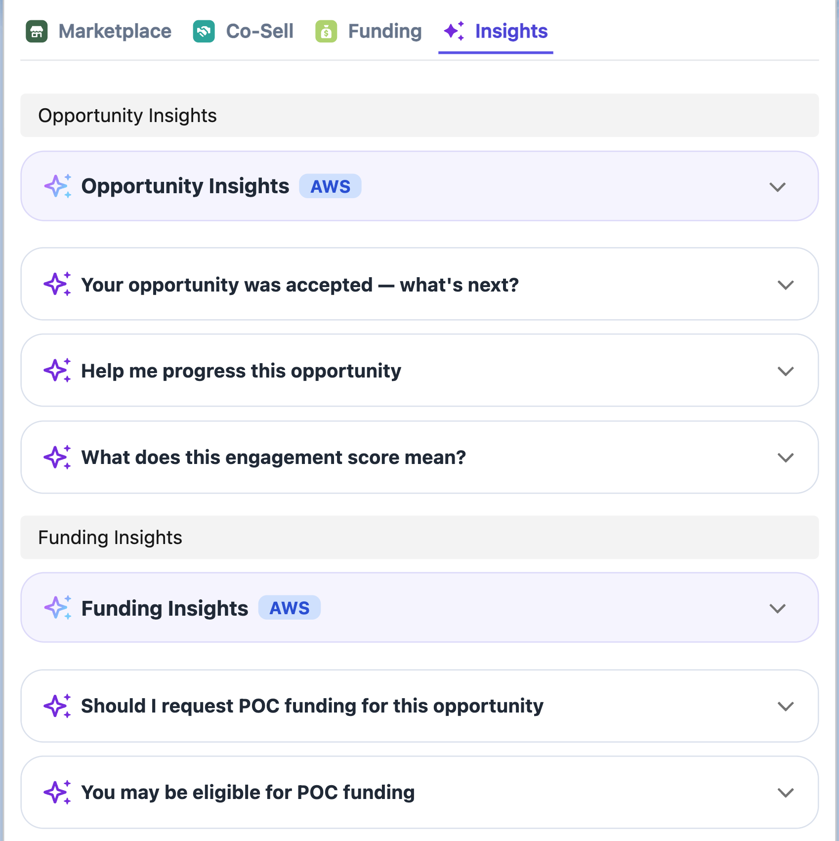 The Suger Widget Insights Tab uses pre-defined triggers to evaluate your opportunity data. It then surfaces actionable cards powered by AWS Co-Sell AI Agents to provide proactive guidance on deal progression, funding eligibility, and risk mitigation.