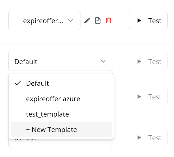 - In the Template column, select an existing template from the dropdown or choose + New Template to create one