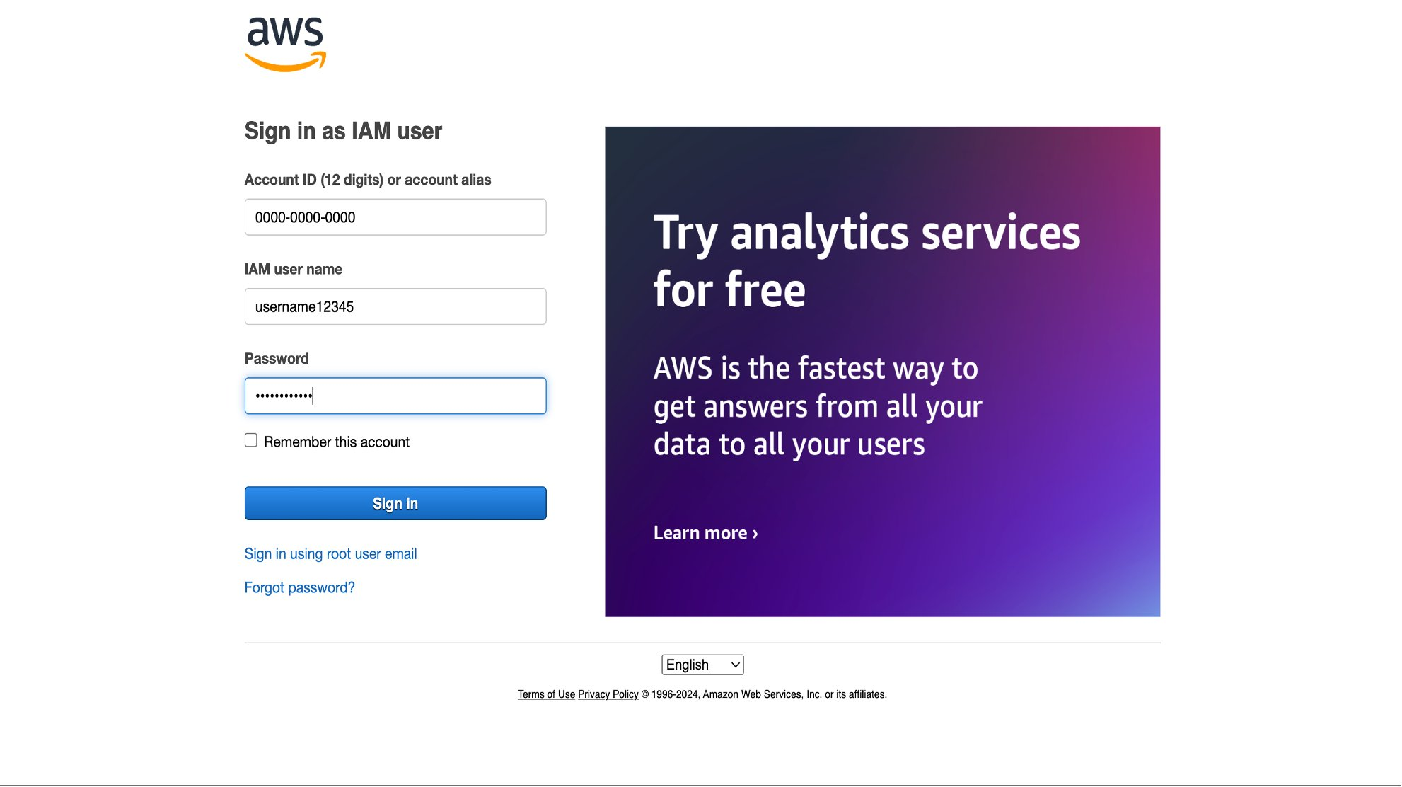 - Sign in with AWS account ID along with its IAM user name, and Password.