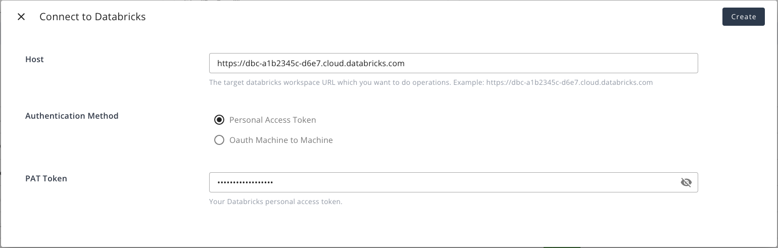 https://<databricks-instance>.cloud.databricks.com - Choose the authentication method you generated in step 2.