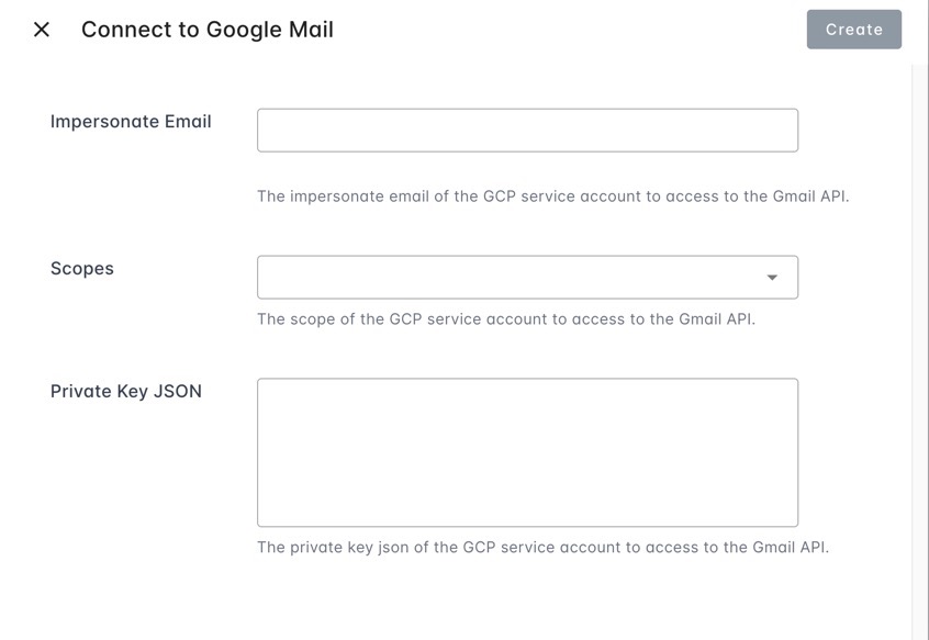 Specify the impersonated email address, select the appropriate scopes configured in the previous step, and store the JSON key file contents within the Suger console integration page.