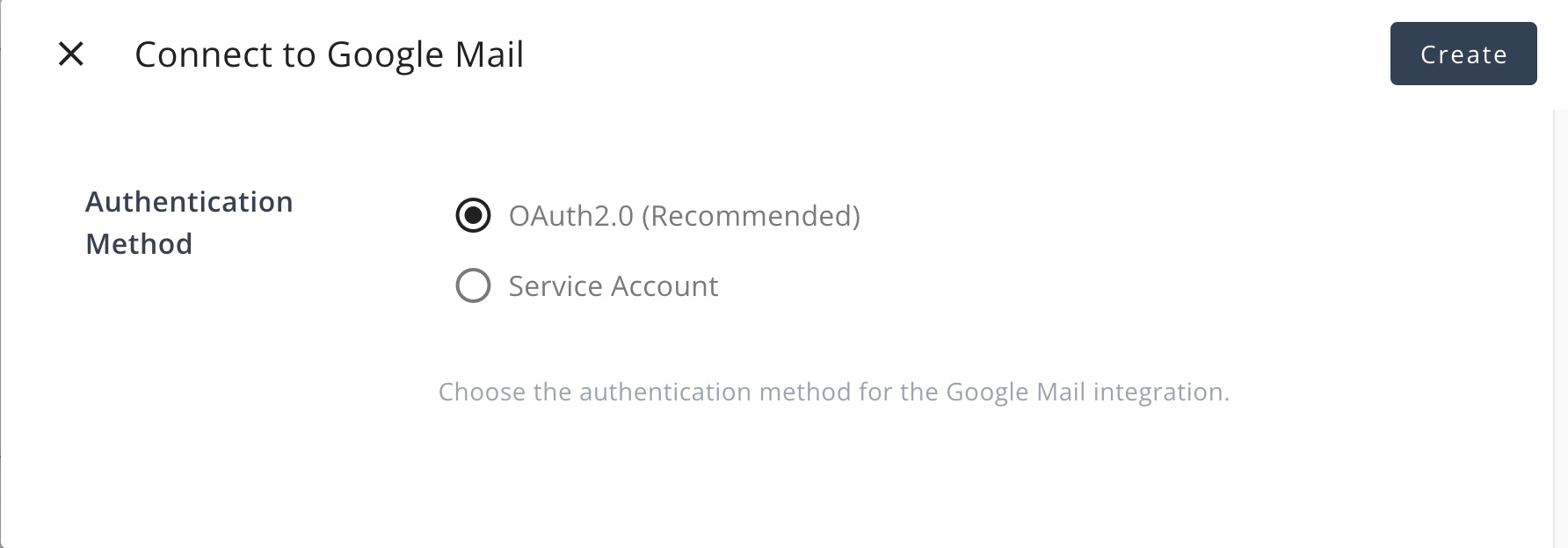 Connect Nowbutton, selectOAuth2.0as the authentication method, and clickCreate. You will be redirected to the Google OAuth2.0 authentication page.