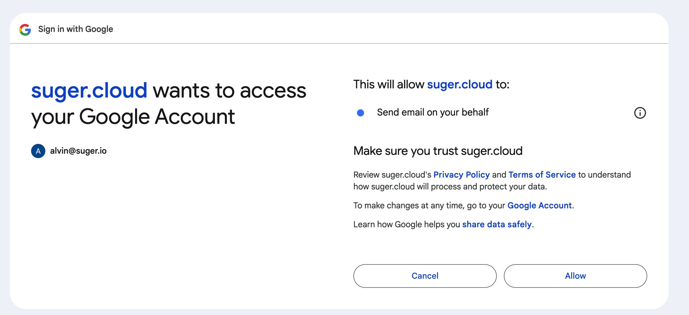 Allowbutton to grant Suger permission to access your Gmail account. This authorization enables Suger to send emails on your behalf.