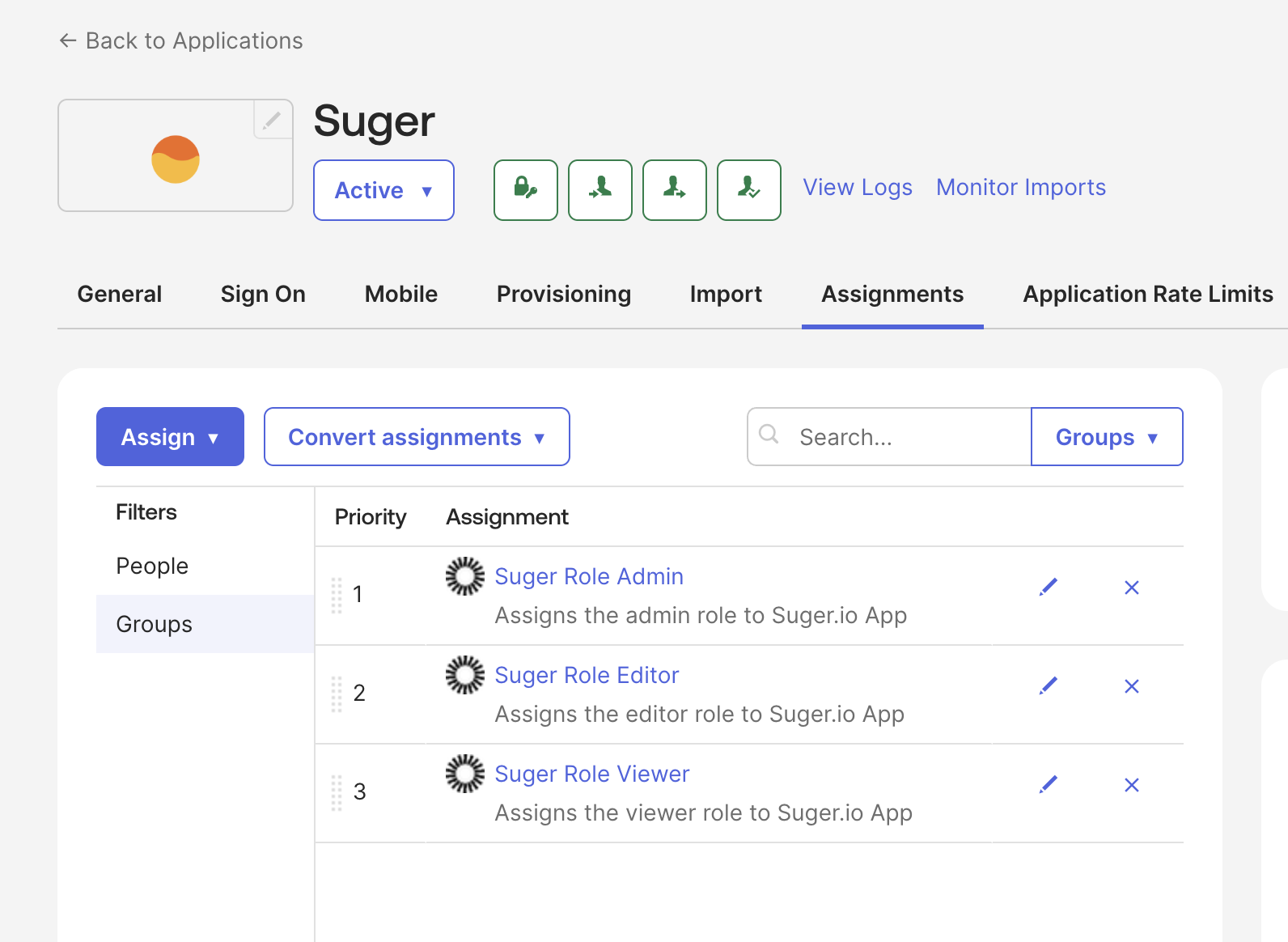 - In Okta, navigate to the Assignments tab of the Suger app.