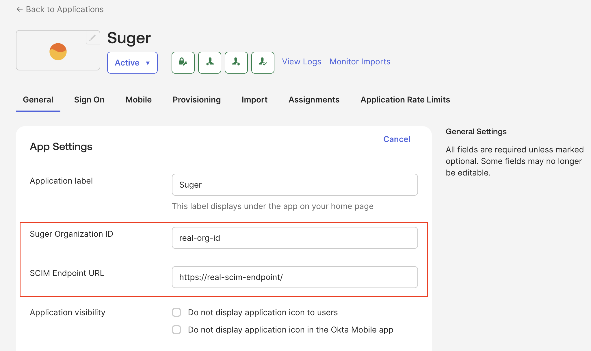 - In the Suger app in Okta, navigate to the General tab and click Edit in the "App Settings" section.