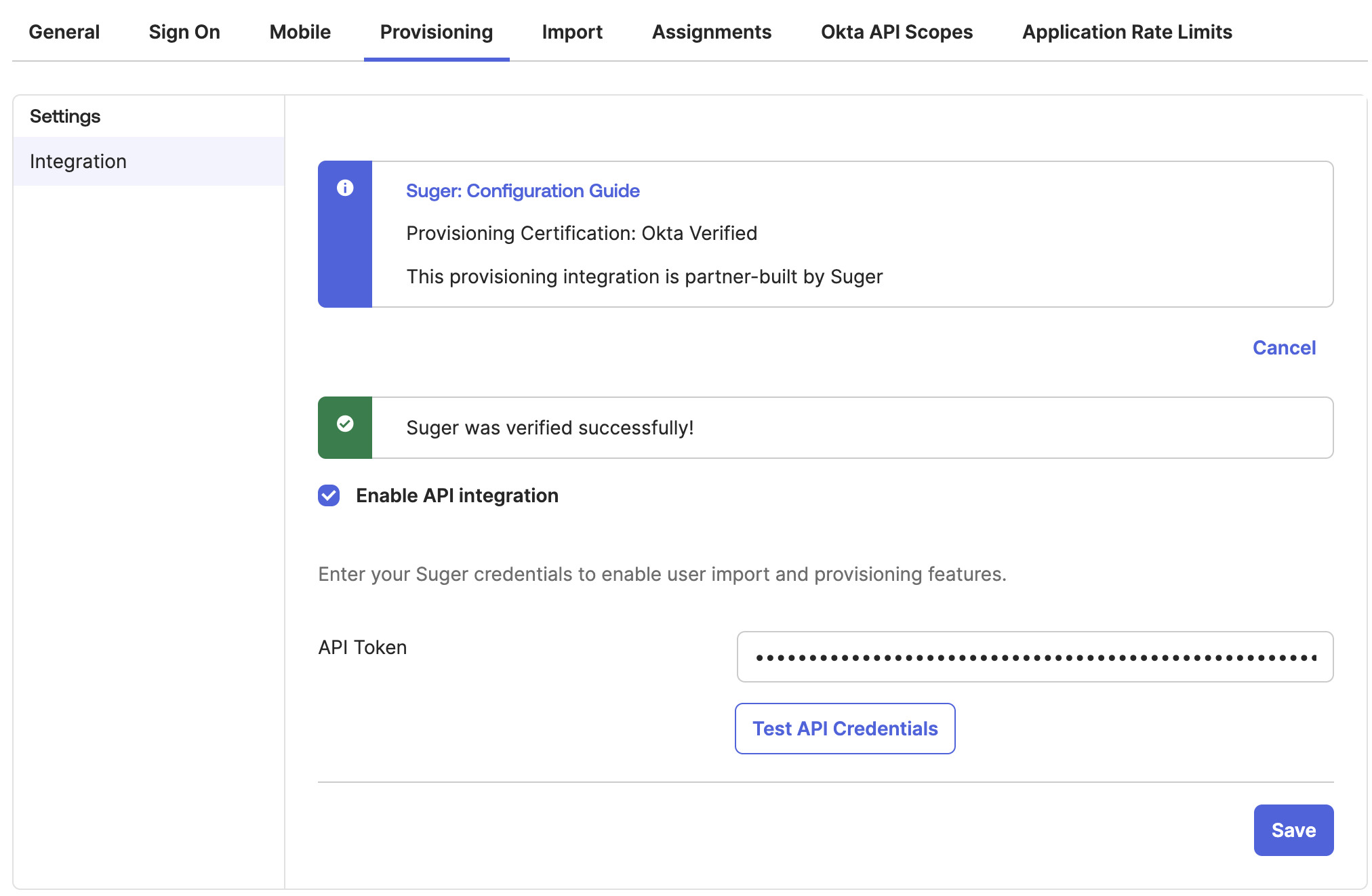 - Navigate to the Provisioning tab and click Configure API Integration.