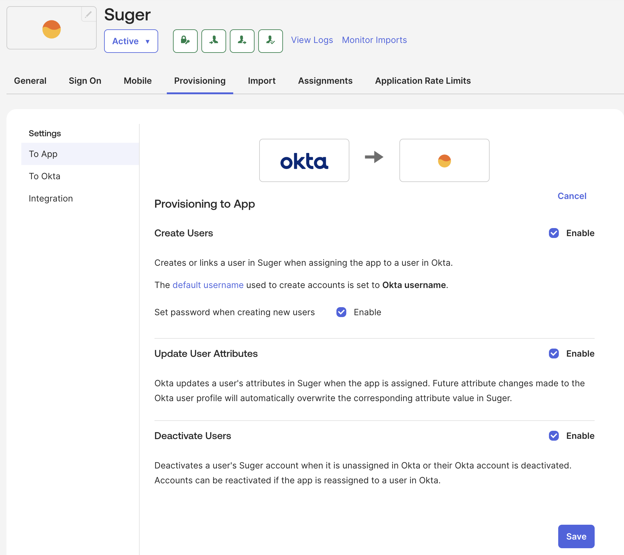 - Deactivate Users: Automatically deactivate Suger users when they are unassigned in Okta.