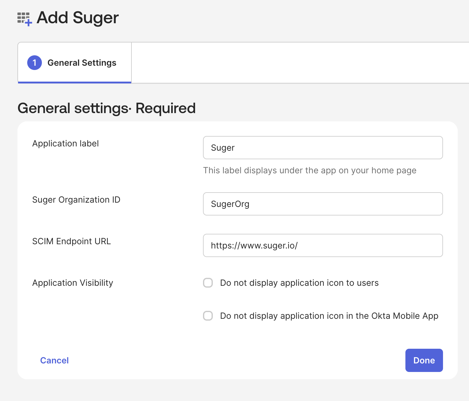 - In your Okta Admin Console, navigate to Applications → Browse App Catalog, search for "Suger" and add it.