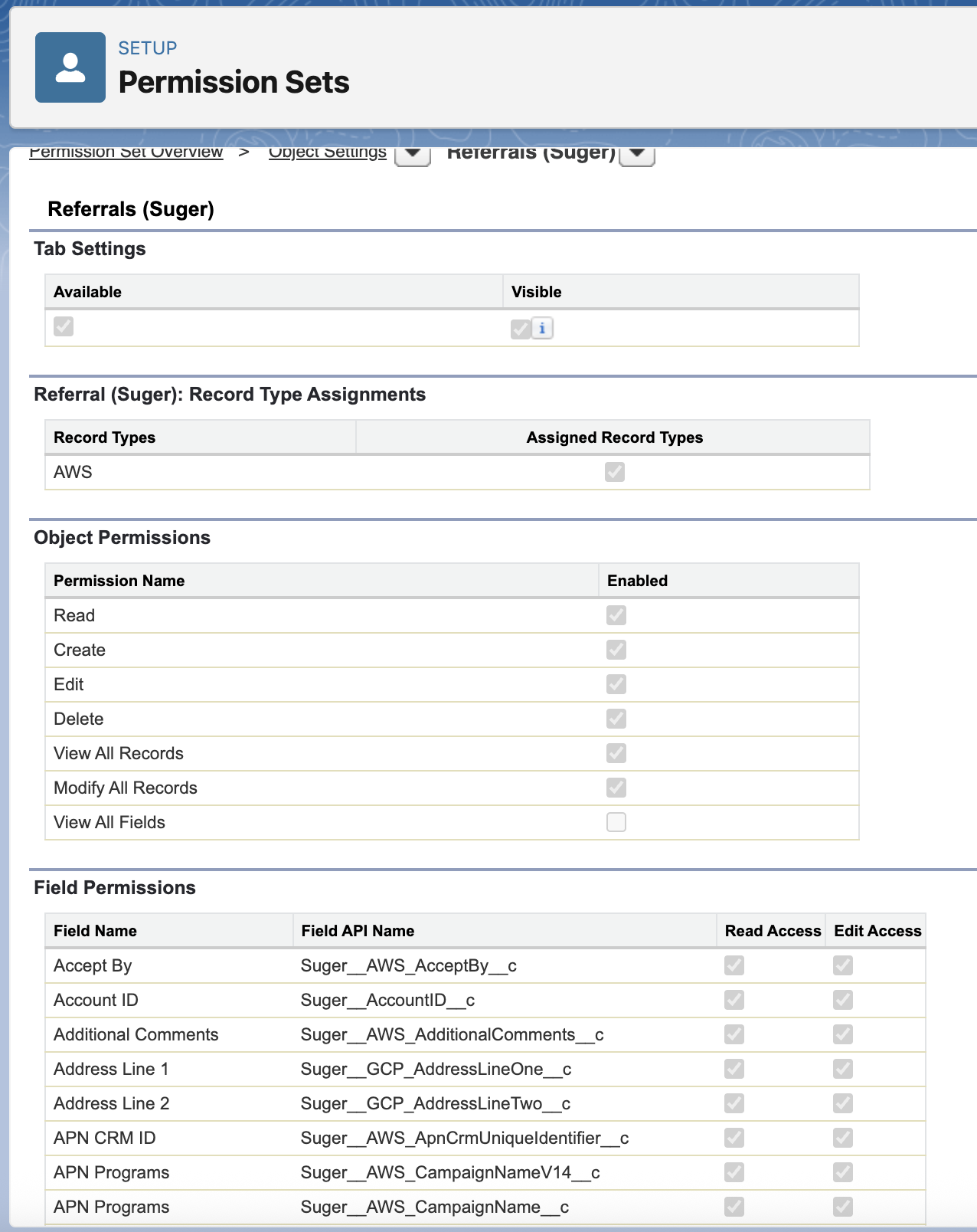 Please verify that your new permission set has read and write access to all fields in the Referral (Suger) object. You can do this by going to Setup → Users → Permission Sets → Your new permission set name → Object Settings → Search for Referral (Suger) → Make sure to have read and write access to all fields in this object. For object permissions, please make sure Read, Create, Edit, Delete, View All Records, and Modify All Records are enabled.
