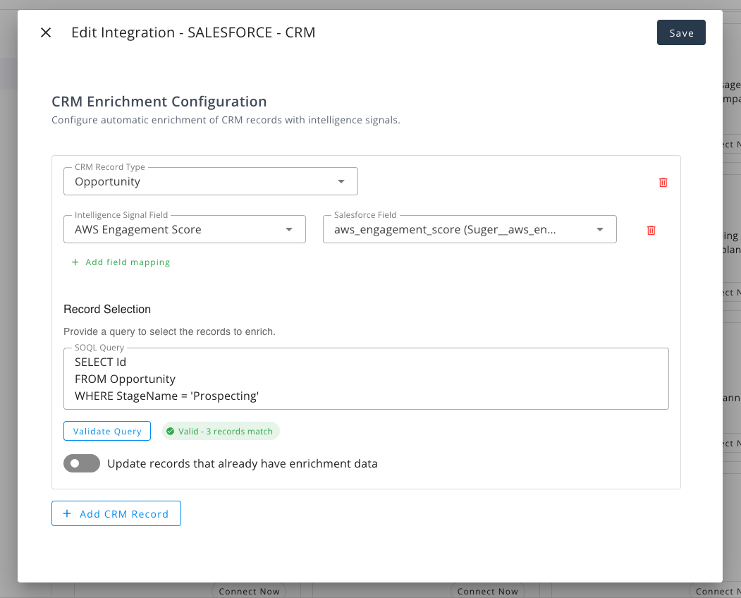 CRM Enrichment allows you to automatically enrich Salesforce records with intelligence signals from Suger. This feature syncs valuable marketplace and engagement data directly to your CRM records, giving your sales team actionable insights without leaving Salesforce.
