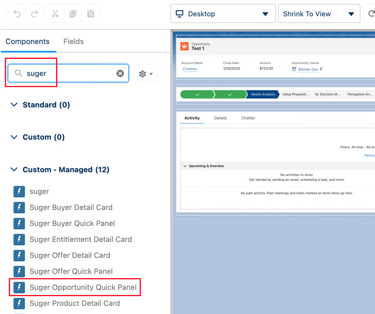 Add the Suger Opportunity Quick Panel component to enable Suger features directly on opportunity records: