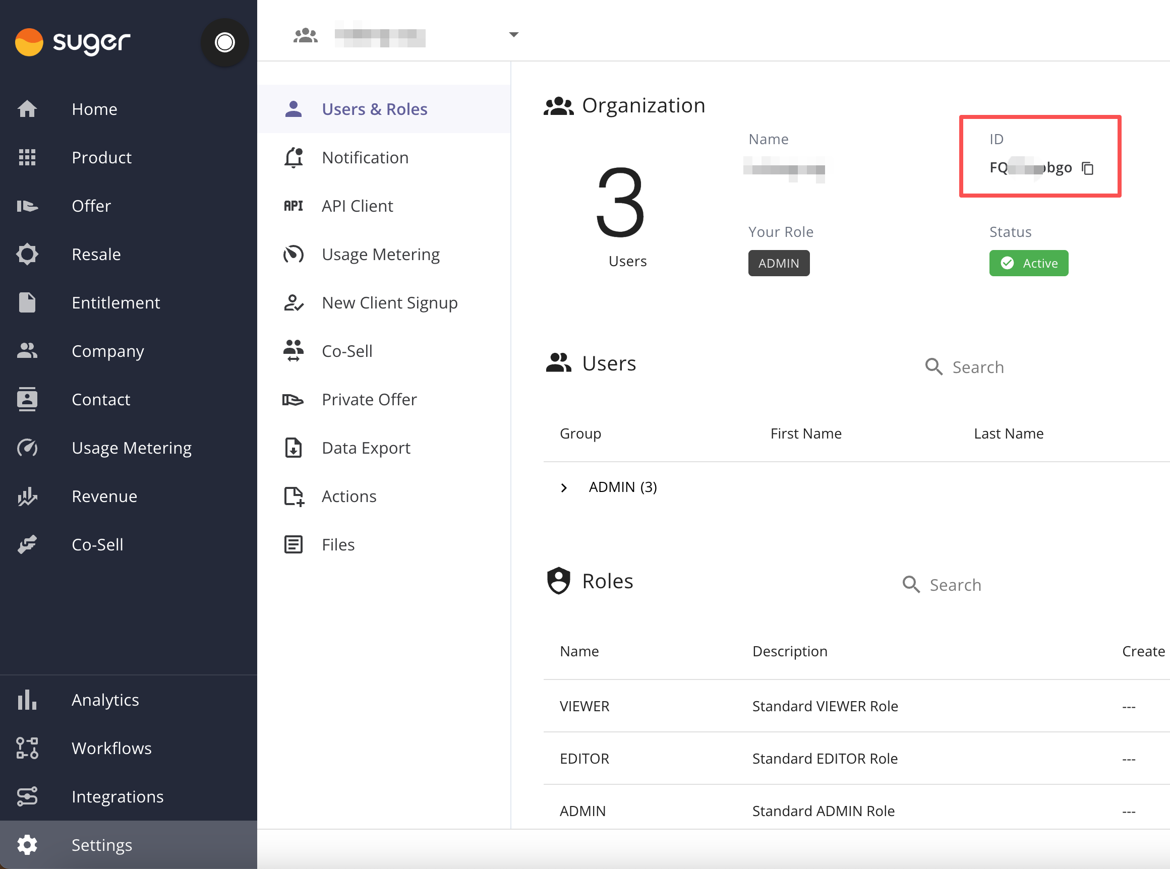 - Organization ID: found in Suger Console → Settings → Organization & Users