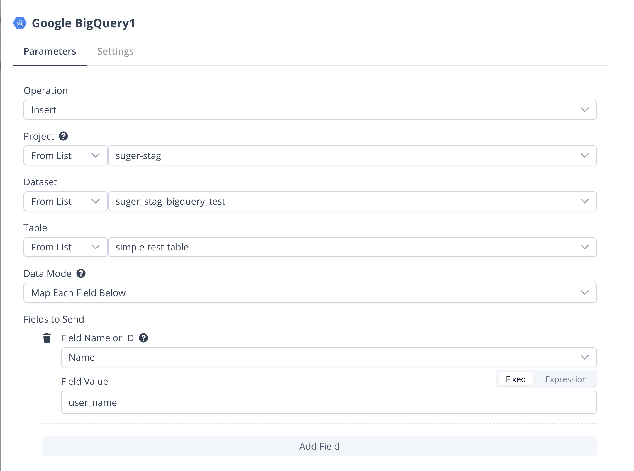 - Auto-Map Input Data: Used when the node input data properties match the table field names. In this mode, make sure the incoming data fields are named the same as the columns in BigQuery.