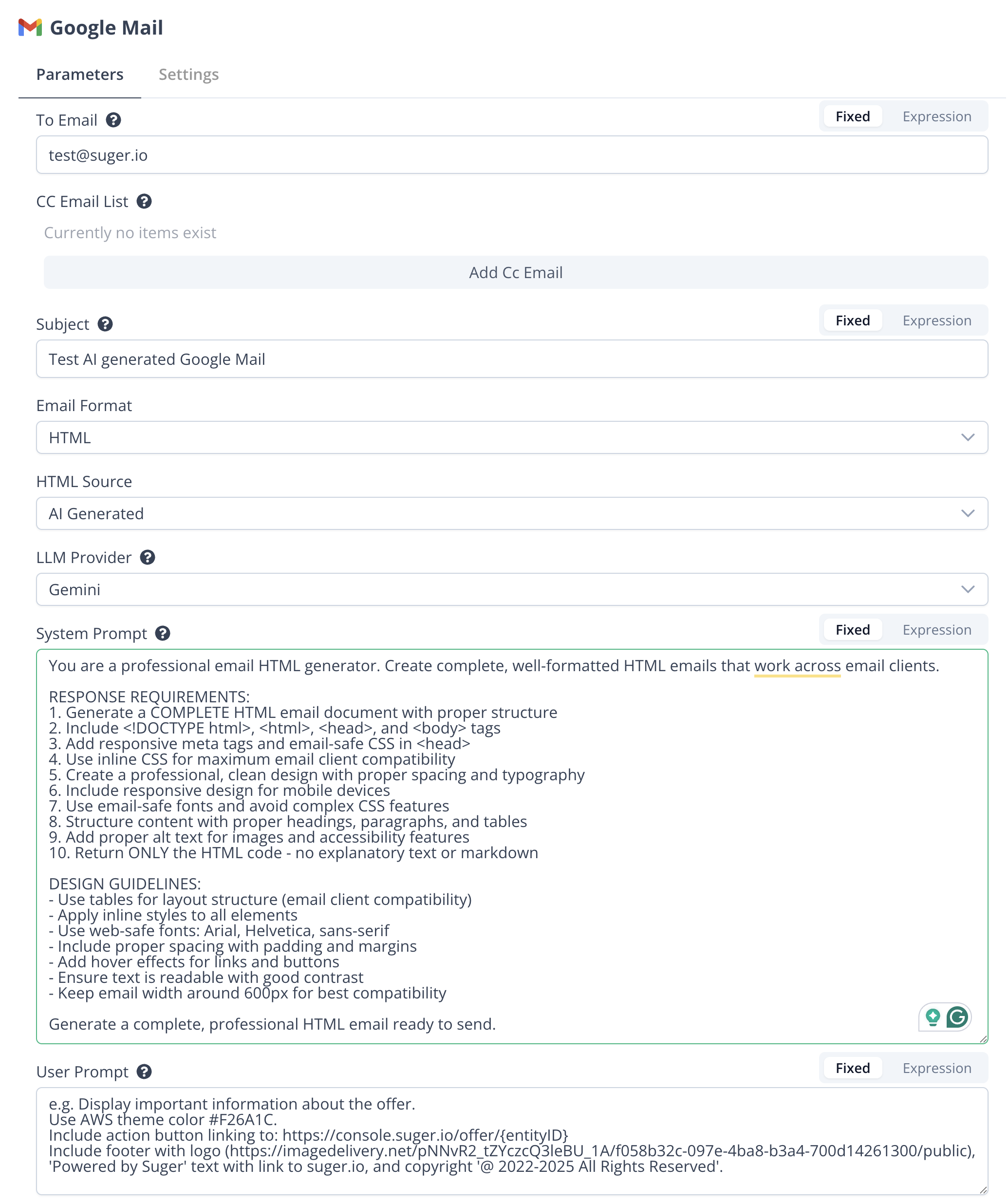 Use AI to generate professional HTML email content dynamically. The following parameters are available: