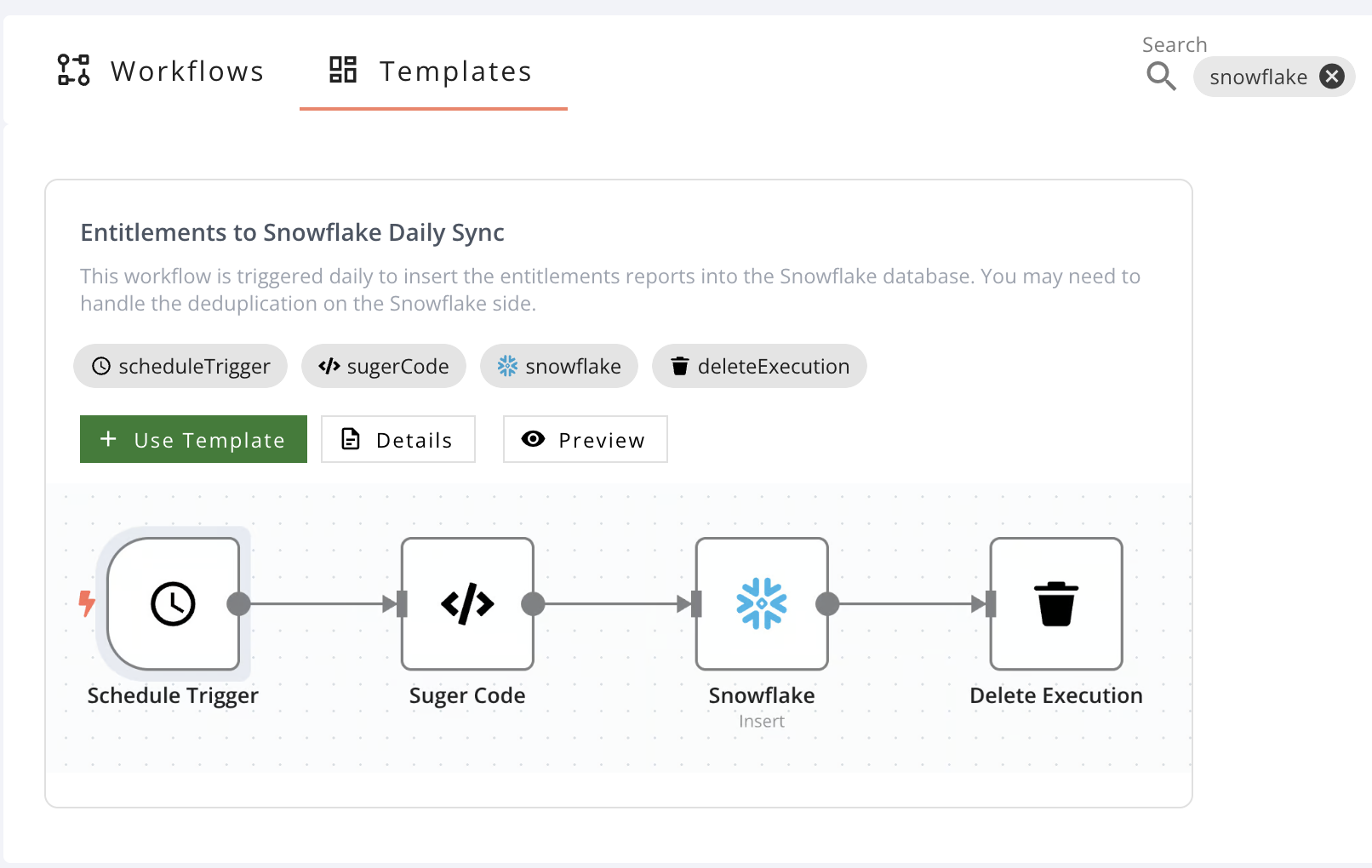 This workflow is triggered daily to insert the entitlements reports into the Snowflake database. You may need to handle the deduplication on the Snowflake side.